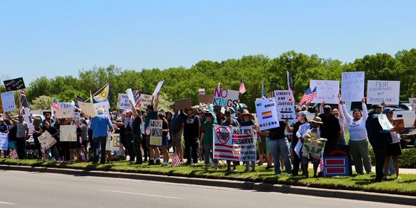 This photo is from the first No Kings! national day of action on June 14th 2025, where over 600 people showed up outside the Farmington Museum and MILLIONS showed up around the world. unified against the corruption from the Trump administration and it's direct attacks on our democracy.